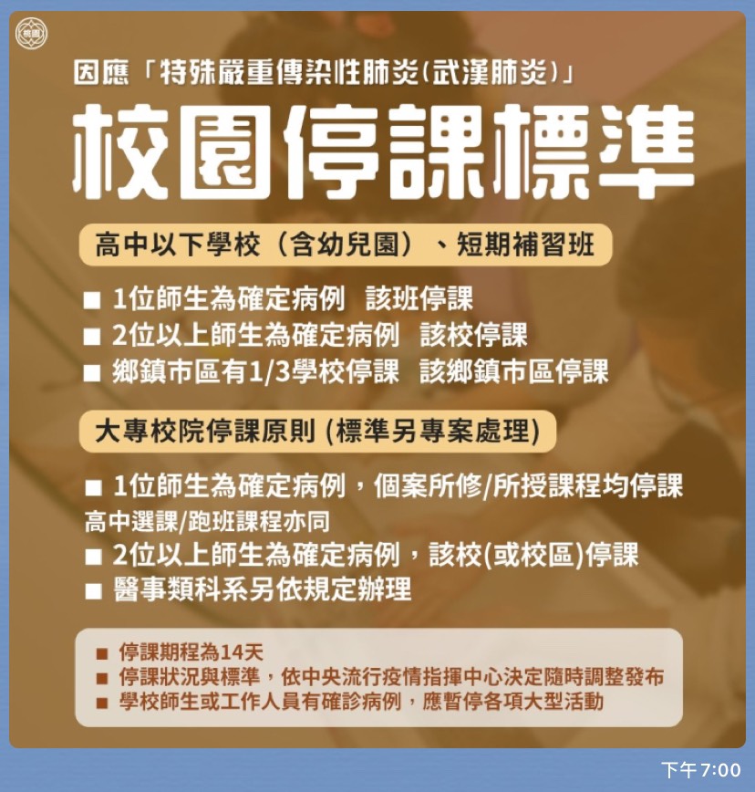 *校園因應「嚴重特殊傳染性肺炎」(武漢肺炎)疫情停課標準